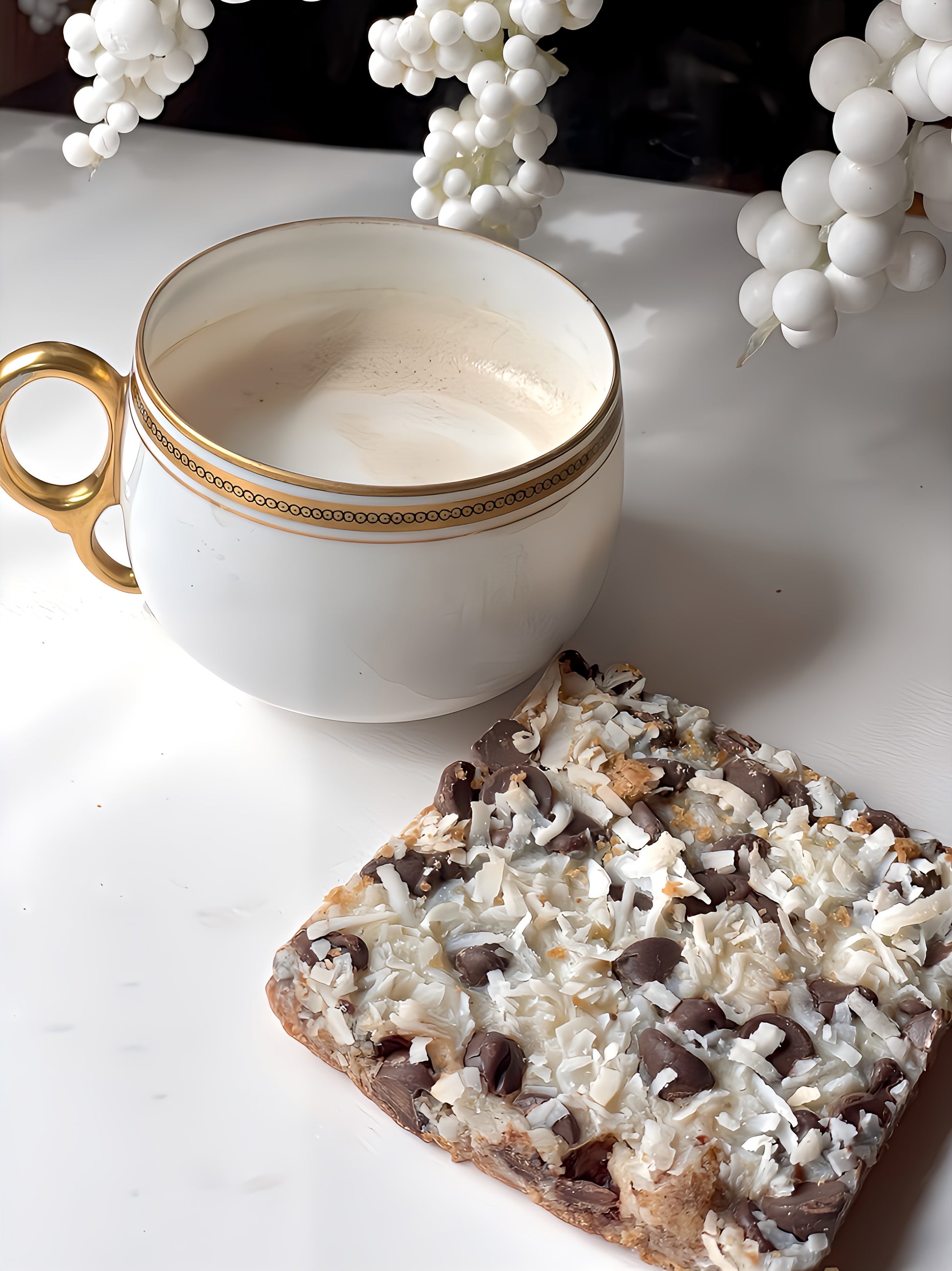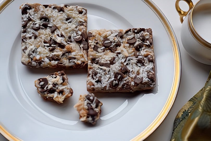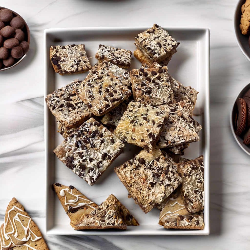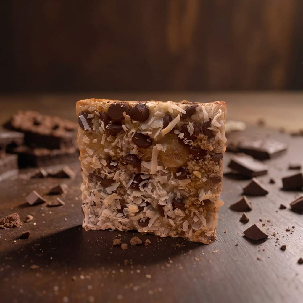 a delicious cookie bar filled with ooey gooey chocolate chips, pecans and sweet coconut flakes on top of a buttery crust baked to absolute perfection!